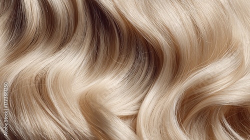 Beautiful wavy strands of light blonde hair flowing in soft, natural waves create an enchanting and elegant appearance under warm, soft lighting in a serene indoor setting