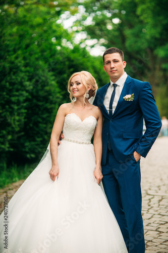 Beautiful wedding couple walking in park. Happy newlyweds