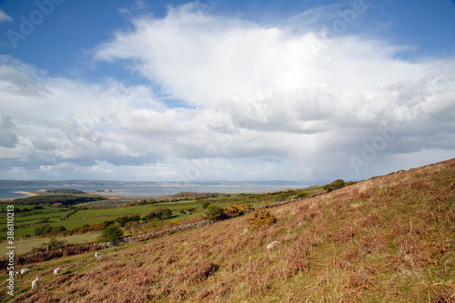 Beautiful Welsh countryside overlooking the north Gower coastline with blue skies, white clouds and sporadic rain.