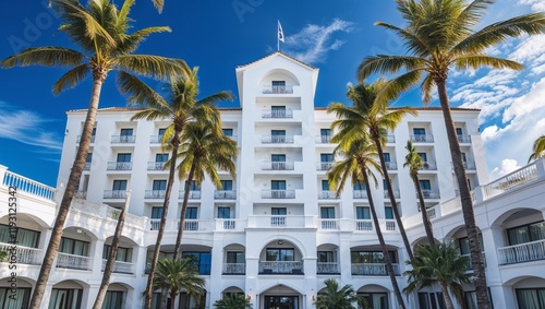 Beautiful white hotel building against blue sky with inviting architecture and serene atmosphere for travelers