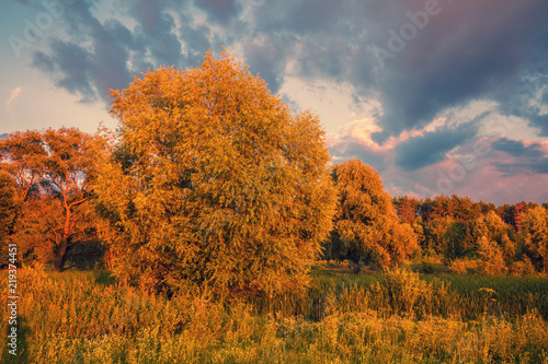 Beautiful wild nature. Lakeshore with trees in evening. Autumn landscape with dramatic sunset sky