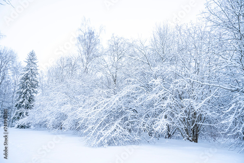Beautiful winter landscape with snow covered trees in the forest. Christmas background.