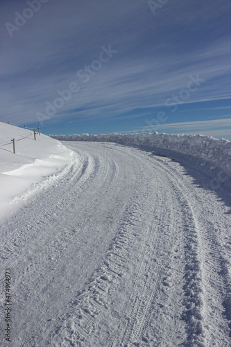 Beautiful winter mountain road covered with snow against the sky with long white clouds. Snowdrifts left on the roadside. Treviso Prealps, Italy. Vertical image.