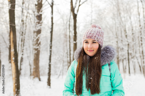Beautiful winter portrait of young woman in the snowy nature