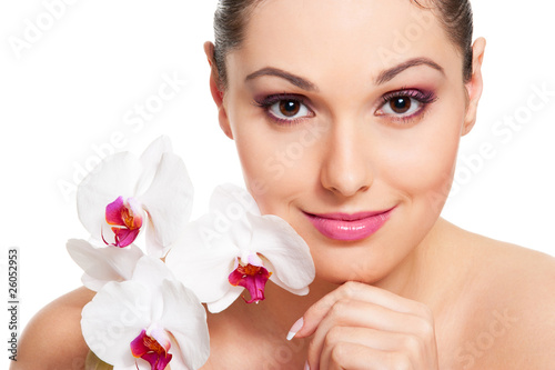 alluring, attractive, beautiful, beauty, brunette, caucasian, charming, cute, cutie, female, friendly, girl, hair, happy, healthy, model, modern, natural, 1, person, portrait, pretty, sexy, skin, smiley, smiling, white, woman, young, youth, head, face, finger, isolated, spa, freshness, clean, complexion, care, flower, orchid