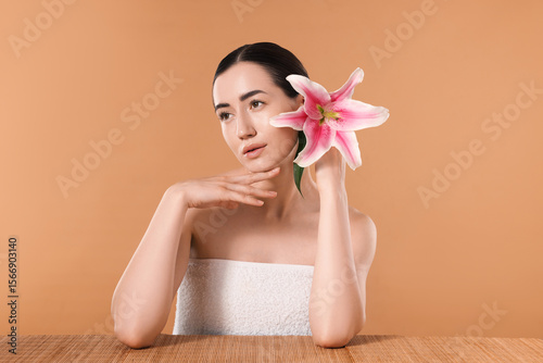 Beautiful woman after spa treatment with lily flower at bamboo table on beige background
