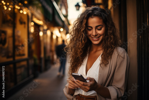 Beautiful woman as she smiles while gazing at her mobile phone, reflecting the joy of modern connectivity and communication. Ai generated