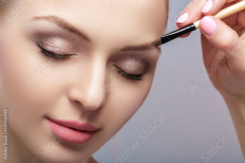 beautiful woman blonde uses professional brush for eyebrow makeup.