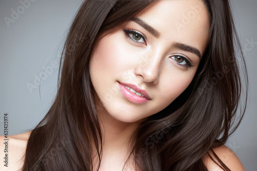 Beautiful woman brunette beauty close-up portrait on gray background.
