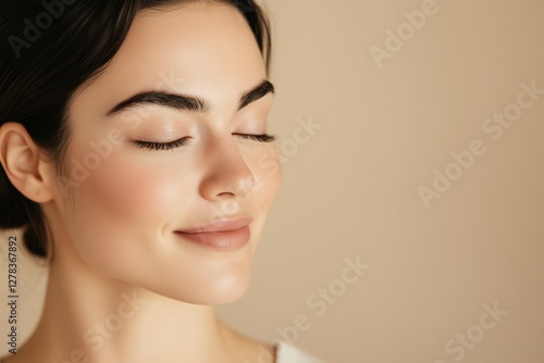 woman, beauty, skincare, make-up, portrait, smiling, closed eyes, cosmetic, wellness, natural beauty, serene, calm, peaceful, relaxation, spa, treatment, beauty product, model, head shot, face, skin, eye, lip, smile, hair, brunette, female, glamour