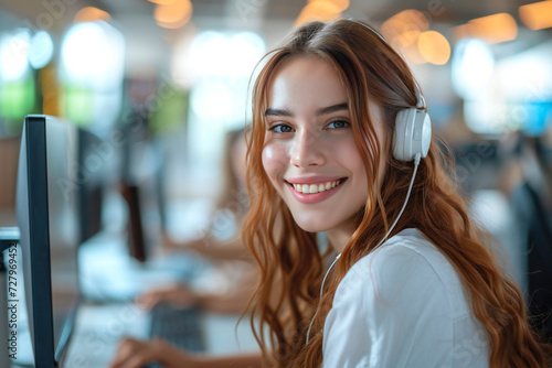 beautiful woman customer support agent smiling in white shirt working on computer in office. Helpdesk, online support services worker.