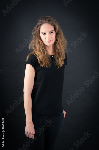 adult, black background, blonde hair, casual attire, cheerful, confidence, content, desire, enjoyment, facial expression, female, glamour, happiness, jean, joy, love, one person, people, satisfaction, sensuality, smile, studio shot, vitality, woman, young adult, blacktop, caucasian
