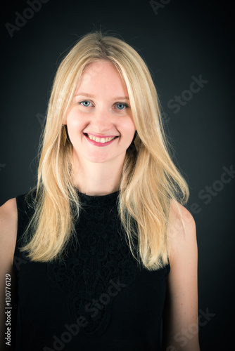 adult, behaviour, black background, casual attire, cheerful, facial expression, fashion model, female, front view, happiness, humor, isolated, joy, laughing, one person, people, real people, smiling, studio shot, toothy smile, woman, blond, caucasian, evening dress, portrait, russian