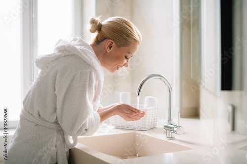 Beautiful woman enjoying in hotel. Young happy women in bathrobe wash her face.