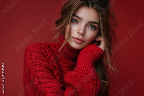 Beautiful woman in a red sweater posing on a colored background, copy space for text, high resolution photography, stock photo