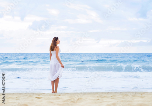 woman, girl, dress, ocean, vacation, summer, beach, female, lady, beautiful, background, calm, idylli, heaven, white, scene, sea, sand, sun, resort, travel, tour tourism, holiday, water, tan, alone, sky, siam, side, back, view, behind, rest, relax, leisure, coast, horizon, get-away, young, destination, wave, blue, standing, brunette, enjoy, zen, peace, joy, face