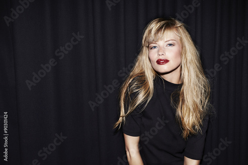 color image, photo, indoor, studio shot, one person, missy, caucasian appearance, long hair, blond, beauty, beautiful woman, black background, curtain, front view, waist up, glamour, fashion, fashion model, black, top, portrait, confidence, blue eye