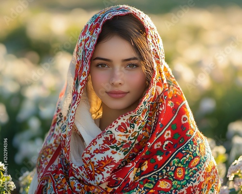 woman, girl, portrait, face, eye, hair, beauty, fashion, model, foulard, headscarf, floral, flower, nature, field, outdoors, summer, sunlight, sun, light, pretty, attractive, gorgeous, elegant, charming, smile, happy, young, skin, make-up, style, texture, pattern, colours, red, white, dress, photo, image, picture, design, art, illustration, aesthetic, vibrant