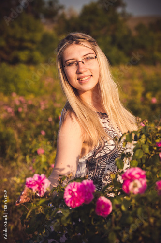 Beautiful woman in garden with roses at sunset