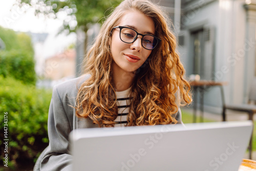 Beautiful woman in glasses with laptop working at table outdoors. Female freelancer with laptop in cafe enjoying weather. Technology concept, remote work.