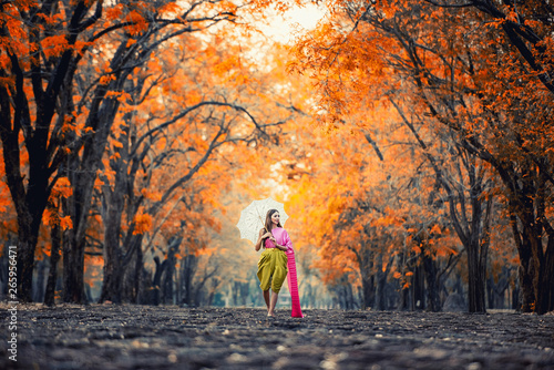 Beautiful woman in traditional dress costume, Asian woman wearing typical Thai dress identity cultre of Thailaand