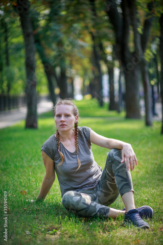 Beautiful woman is sitting on green grass. Woman in a dark brown t-shirt and khaki military pants. Young girl in the park.