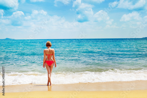 Beautiful woman is standing at beach at a blue sea background on