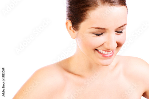 woman, girl, person, young, adult, female, beautiful, beauty, attractive, gorgeous, smile, smiling, laughing, laugh, laughter, brunette, brown hair, caucasian, closed eyes, copy space, topless, cosmetic, make up, skincare, complexion, pure, white teeth