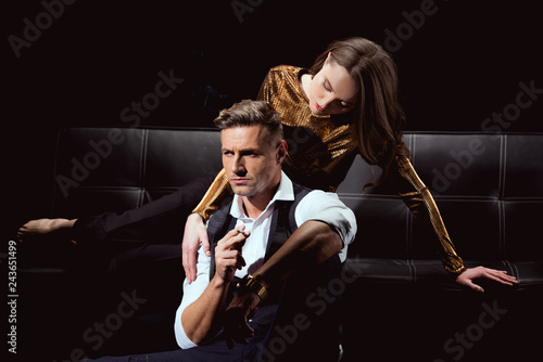 beautiful woman lying on couch and embracing handsome man with cigarette isolated on black