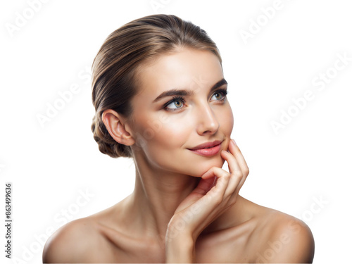 Beautiful woman model with clean fresh skin isolated on transparent background, skin care or cosmetic ads concept