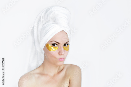 Beautiful woman on a white background with a towel on her head, Patch Under Eyes, looking directly at the camera. Beauty, natural youth, Collagen Mask On Fresh, radiant facial skin.