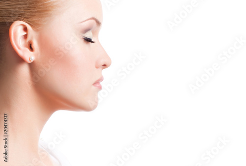 indoor, studio, portrait, closeup, blond, hair, woman, female, young adult, pretty, cute, attractive, beauty, beautiful, make-up, make-up, isolated, white, background, cut-out, coiffure, caucasian, one person, people, healthy, positive, horizontal, profile, half face, style, face