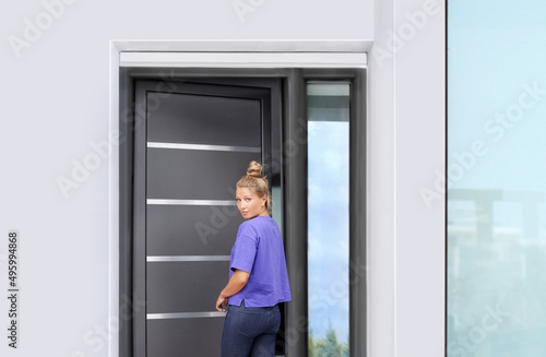 attractive, beautiful, building, bye, caucasian, cheerful, closing, coming, dating, design, door, door handle, entering, entrance, entry, family, female, front, girl, adieu, happy, home, house, homemaker, inviting, leaves, living, looking, meeting, modern, open, people, safety, smile, standing, summer, tanned, visit, waiting, welcome, white, wife, woman, wooden