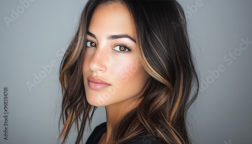 portrait, woman, face, female, eye, hair, model, beauty, fashion, style, attractive, pretty, gorgeous, glamour, make-up, skin, smile, expression, looking, pose, photo, studio, photo, photographer, background, grey, colours, lighting, natural, casual attire, coiffure, long, wavy, brown, lip, mouth, eyebrow, cheek, nose, ear, neck, shoulder, blond, highlight, light, professional