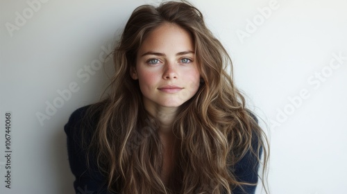woman, portrait, girl, female, model, face, beauty, pretty, hair, long hair, brown hair, wavy hair, make-up, natural makeup, skin, eye, blue eye, freckle, expression, calm, serene, confident, attractive, elegant, stylish, fashion, lifestyle, people, studio, background, white background