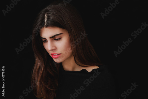 Beautiful woman portrait on ebony background looking down
