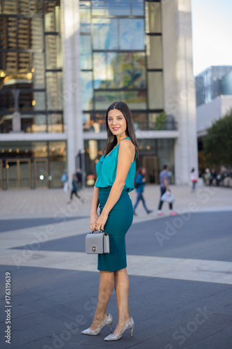 beautiful woman, big eye, blue, comfortable, confidence, dress, earring, elegance, face, fashion, green, happy, tower block, light, low-cut, pretty, smile, sunset, trend, young