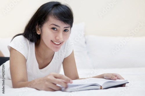 reading, book, woman, asian, indonesian, japanese, chinese, indian, hispanic, people, person, beautiful, girl, female, attractive, adult, young, lifestyle, beauty, happy, pretty, smiling, portrait, relax, leisure, cute, read, looking, white, positive, friendly, smile, study, student, education, lying, bedchamber, pillow, bed, home, casual attire, relaxing, teenage, cheerful, reader, learning, open, page