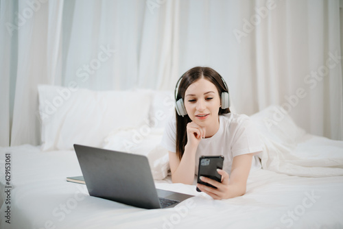 Beautiful woman resting and watching movie in bed at bedroom in morning Lifestyle
