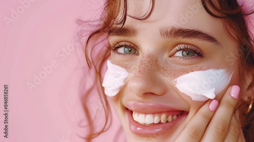Beautiful woman smile use cream for good skin. face of a healthy woman apply cream and makeup. Advertisement for skin cream, anti-wrinkle, baby face, whitening, moisturizer, tighten pores