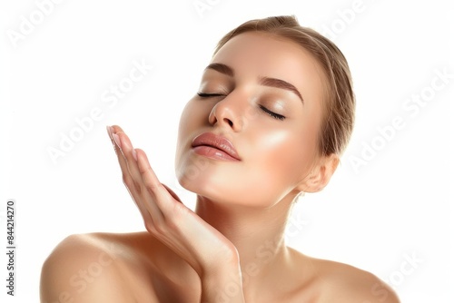 Beautiful woman touching her face with beautiful skin, young girl model touching neck, spa or cosmetics advertisement, beauty concept, cosmetic concept, skin medical beauty concept
