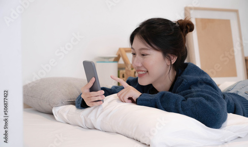 Beautiful woman using a smart phone in the morning on the bed at home