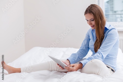 Beautiful woman using tablet computer on her bed