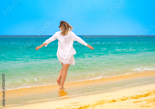 Beautiful woman walking on sunny beach Santa Maria, Sal Island, Cape Verde