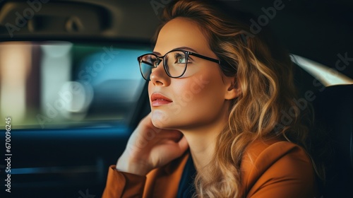 Beautiful woman wearing glasses sitting in a car, woman traveling, woman with life style