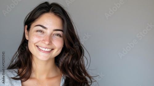 Beautiful woman with a radiant smile, looking at the camera. Copy space on the right for text or logo.