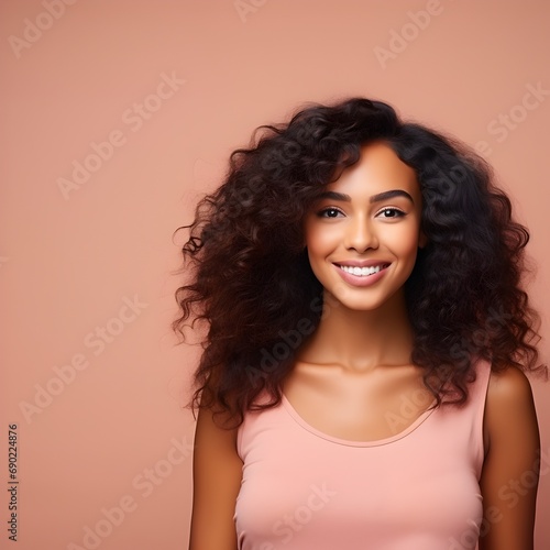 Beautiful woman with an afro hairstyle on peach studio background