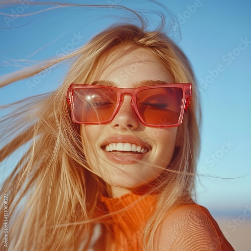 beautiful woman with blonde hair, red sunglasses, smiling under a sunny sky