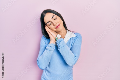 Beautiful woman with blue eyes standing over pink background sleeping tired dreaming and posing with hands together while smiling with closed eyes.