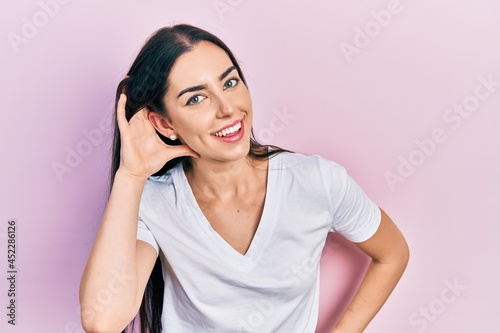 Beautiful woman with blue eyes wearing casual white t shirt smiling with hand over ear listening and hearing to rumor or gossip. deafness concept.